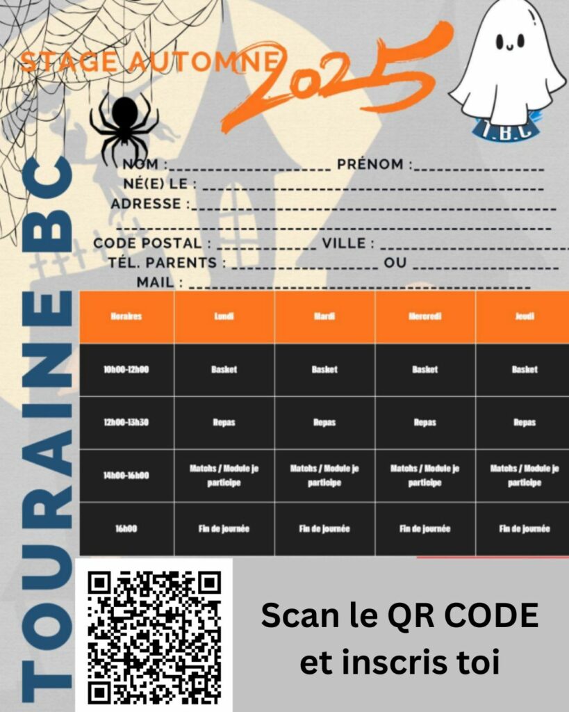 Pour s’inscrire rempli le formulaire ici : https://www.helloasso.com/associations/touraine-basket-club/evenements/stage-halloween-2025